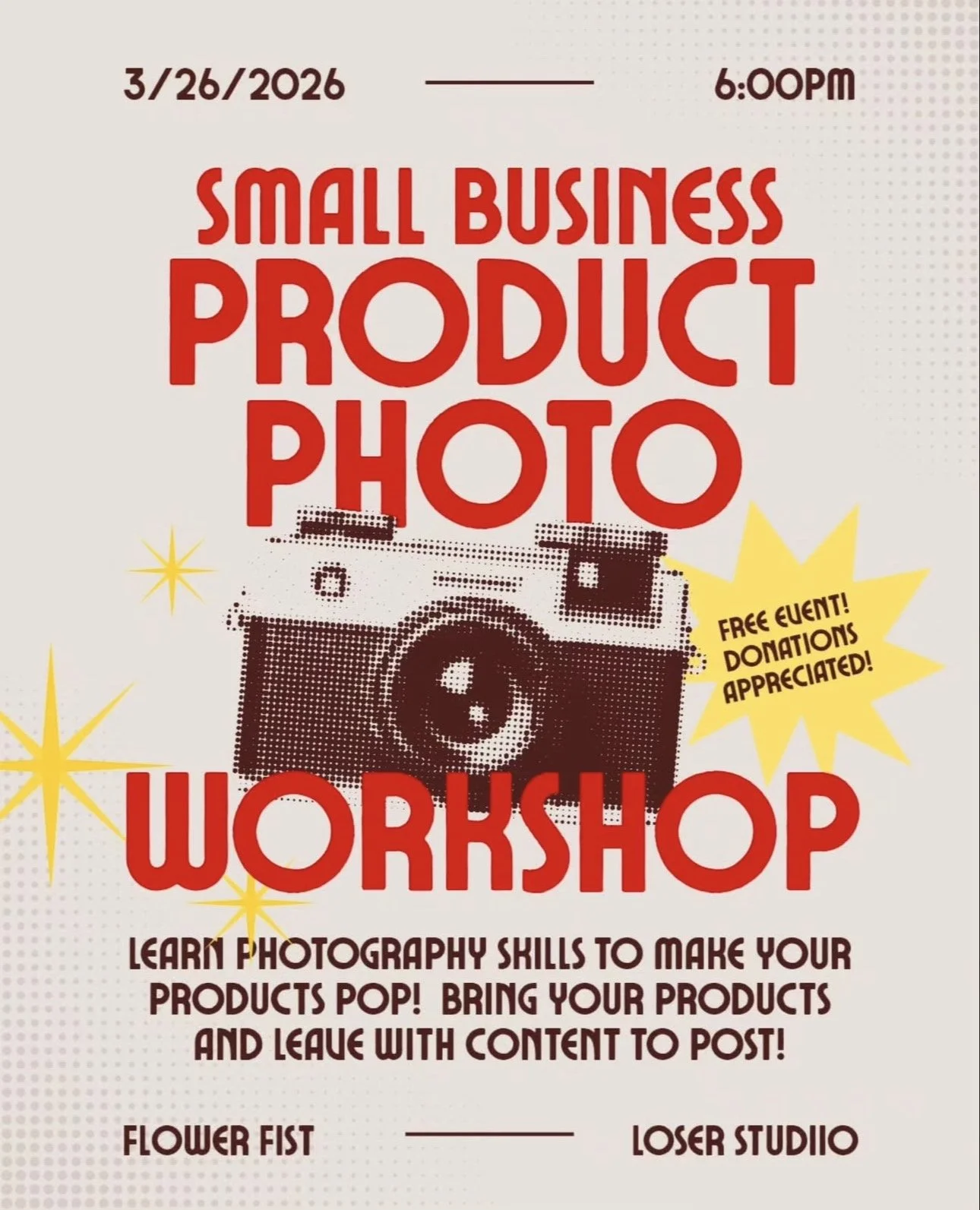 Looking for ways to make your products and merch shine? Loser Studio will be hosting a workshop on product photography on March 26th at 6PM.