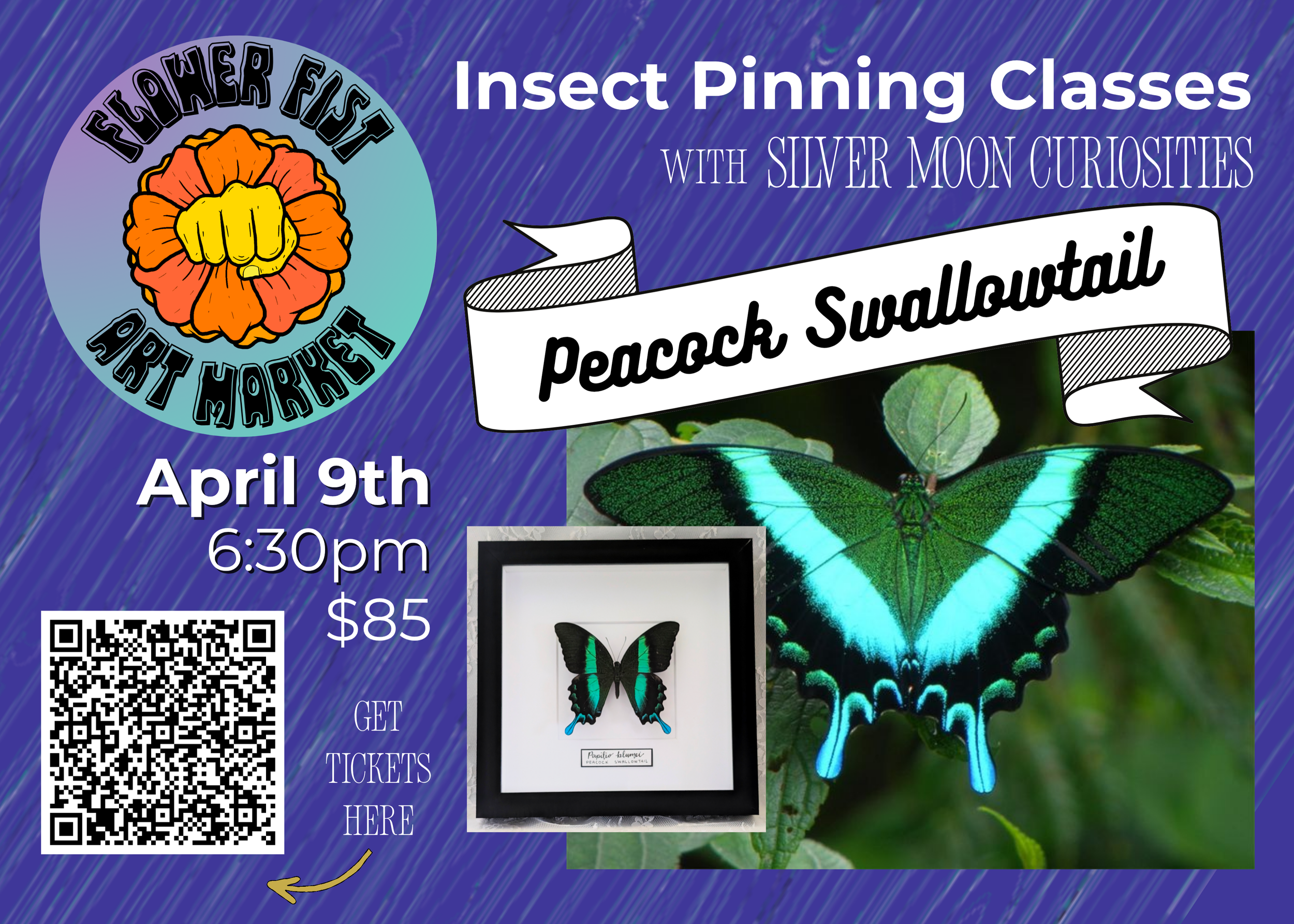 Join us Thursday, April 9th at 6:30pm to learn the art of insect pinning! This class will feature the gorgeous Peacock Swallowtail Butterfly and will cover all the ins and outs of how to position and preserve your own insect specimen for display.